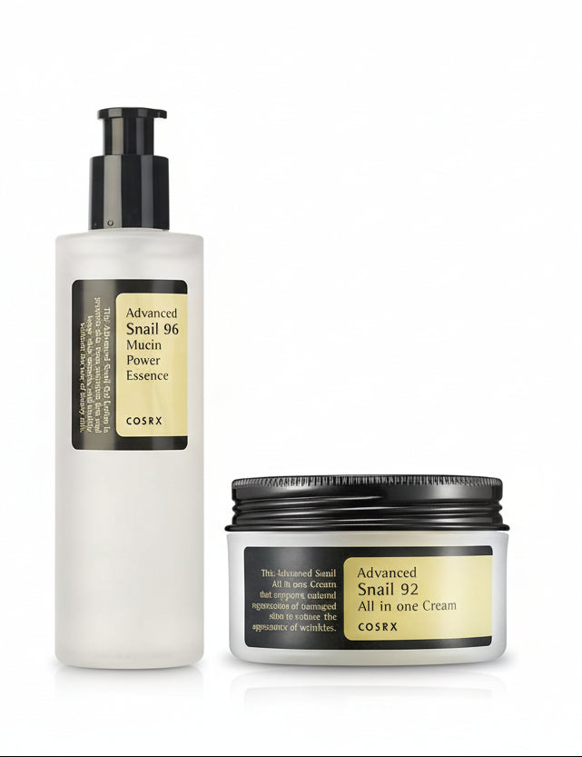 The COSRX Advanced Snail Skincare Set combines two best-selling Korean skincare essentials designed to deeply hydrate, repair, and strengthen the skin barrier. The Advanced Snail 96 Mucin Power Essence is formulated with 96% Snail Secretion Filtrate to deliver lightweight hydration, improve skin texture, and enhance elasticity.